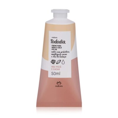 O Creme Nutritivo para as Mãos Tododia Noz Pecã e Cacau possui FPS 20, que protege dos raios UVA e UVB, previnindo o envelhecimento precoce da pele. Fragrância envolvente e delicada para deixar suas mãos macias e perfumadas Tododia.