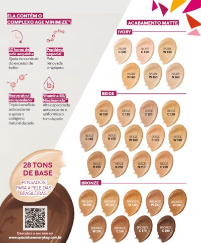Sendo um dos produtos mais clássicos da Marca nº1 de Base do Brasil, a Base TimeWise® 3D possui 28 tonalidades em acabamento matte com 12 horas de controle de oleosidade, cobertura perfeita e construível da forma que você preferir e ainda cuida da sua pele com o exclusivo Complexo Age Minimize 3D®.