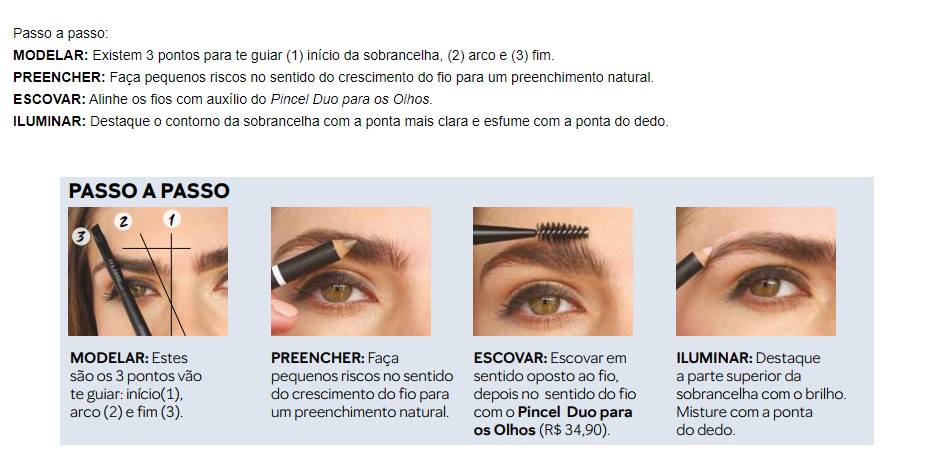 Dicas de Aplicação: Com a ponta que tem a cor mais aproximada da sua sobrancelha, faça traços curtos e suaves para definir e preencher as sobrancelhas onde for necessário. Com a ponta mais clara, faça uma linha contornando o desenho da sobrancelha para levantar o olhar.